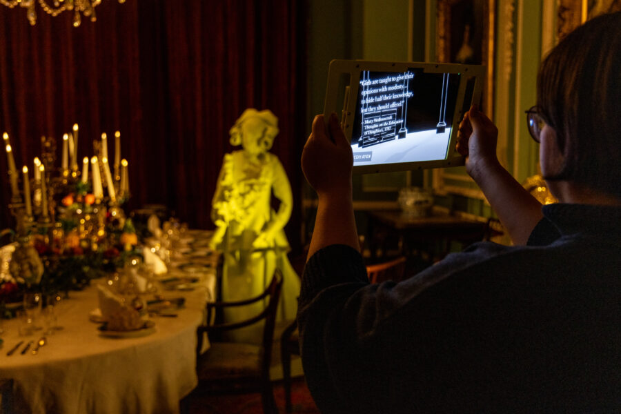 Visitors encounter the virtual characters of three women who lived at Tatton Park Estate between 1680 and 1799: Beatrix, Hester, and Elizabeth Egerton. Their imagined life stories and aspirations were developed in collaboration with actresses, creative technologists, and a professional writer, informed by conversations with Tatton Park’s historians and staff. The experience unfolds across Tatton Park Mansion’s principal rooms, where immersive experiences and handcrafted physical artefacts act as portals for visitors to step into their imagined realities.